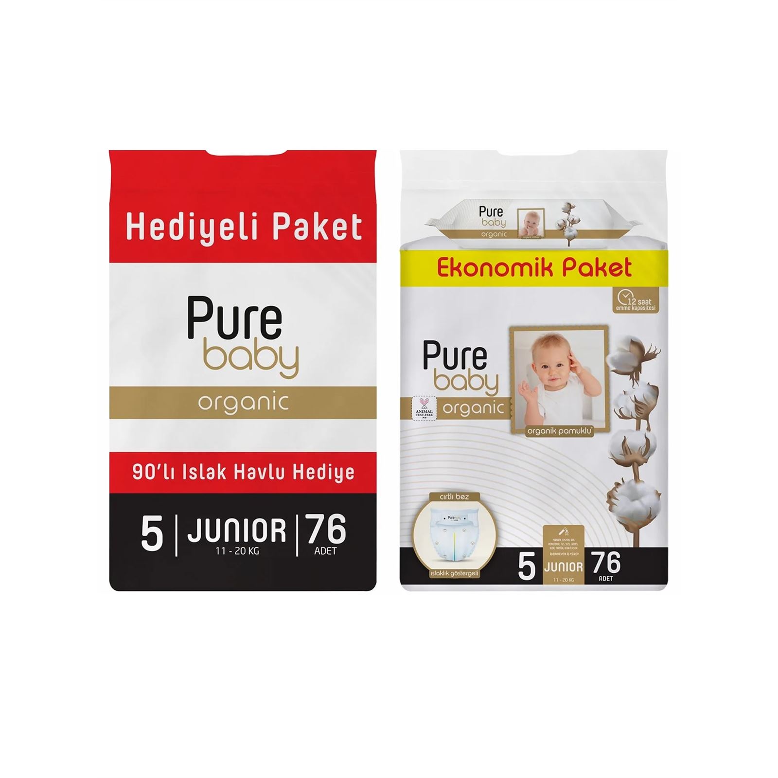 Pure Baby Organik Pamuklu Cırtlı Bez 5 Numara Junior 76 Adet + Organik Pamuklu Islak Havlu 90 Yaprak