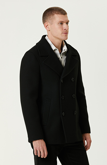 Siyah Çıkma Mostralı Kruvaze Yaka Diyagonal Kaban